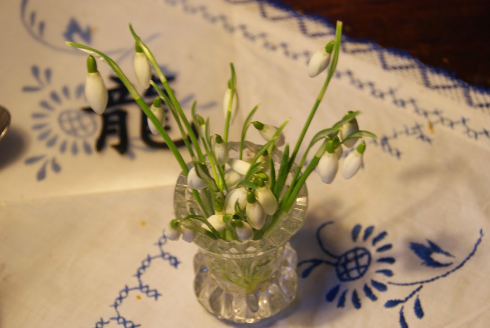 Jeg har været ude at plukke vintergækker i dag. De står på spisebordet i køkkenet. Det er altid de første forårsblomster vi har indenfor hvert år.